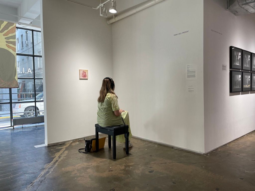 There’s something so physically soothing and regenerative about the sonic landscape, partially due to the consistent beating and balance of high and low pitch registers. I felt the recurring desire to shut my eyes, my shoulders dropping, and the beginning of a gentle rocking motion in my spine. The sounds are enveloping, well panned and the volume in the headphones is encompassing without being uncomfortably loud. This primal desire to go inward danced with the innate vulnerability of being physically cornered, eyes shut with my back to people in the gallery.