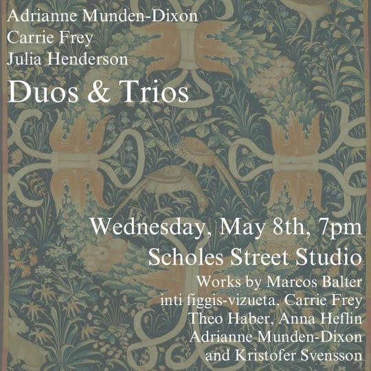 Anna Heflin (AH): First things first you have a concert in Brooklyn at Scholes St Studio (375 Lorimer St; donation based at door NOTAFLOF) on May 8 featuring music by Theo Haber, Kristofer Svensson, inti figgis-vizueta, Marcos Balter, and pieces by the three of us to round out the evening! Can you share a little about the curation of this program?