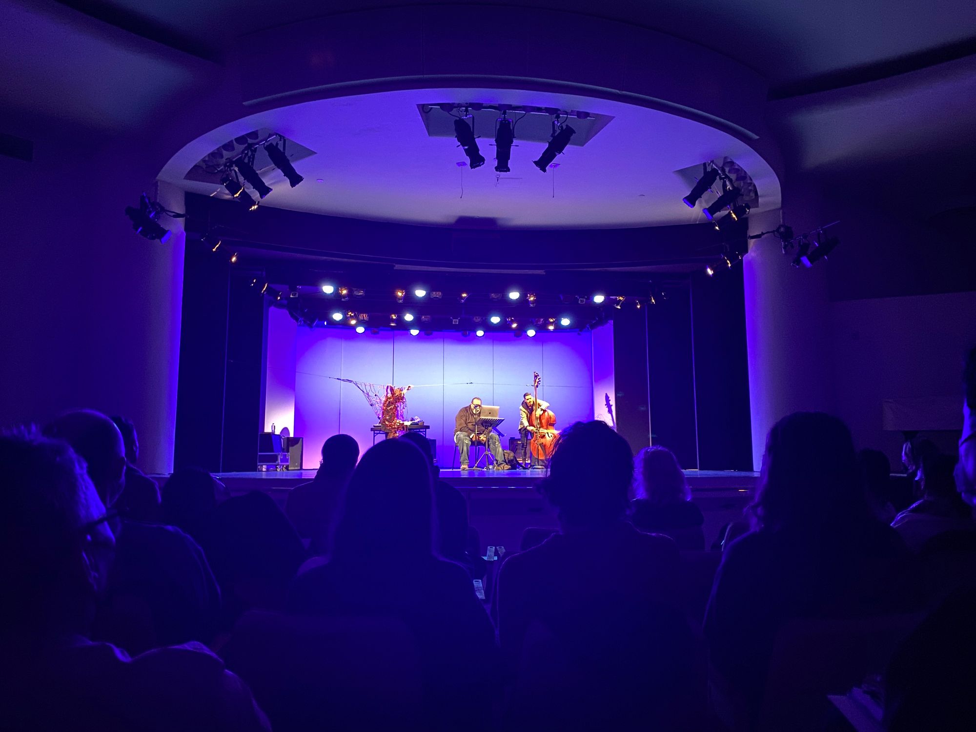 One of Jones’s first questions to Brandon López in the conversation was in regards to how he thinks about intention setting in the context of improvisation. What I took away from his answer is that he prefers to instead stay incredibly present and listening, mindful of the time down to the milliseconds that precede him, and only brings intention in when something feels out of alignment. Moten shared his intention to continue thinking about his voice as an instrument as much as possible – which López assured him was already happening. This intention setting from Moten resulted in my ears clocking the role of the voice during the improvisation, paying special attention to the moment when Moten diverged from the linear text and repeated the word “Oh” in accordance with Cecilia Lopez’s repeated electronic figure.
